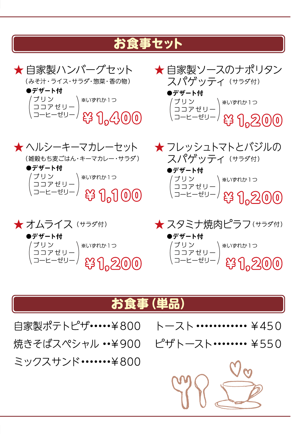 他にもピザやスパゲティ、ハンバーグ定食やカレー、ランチメニューも健康に気を遣った優しい味でお出ししています。